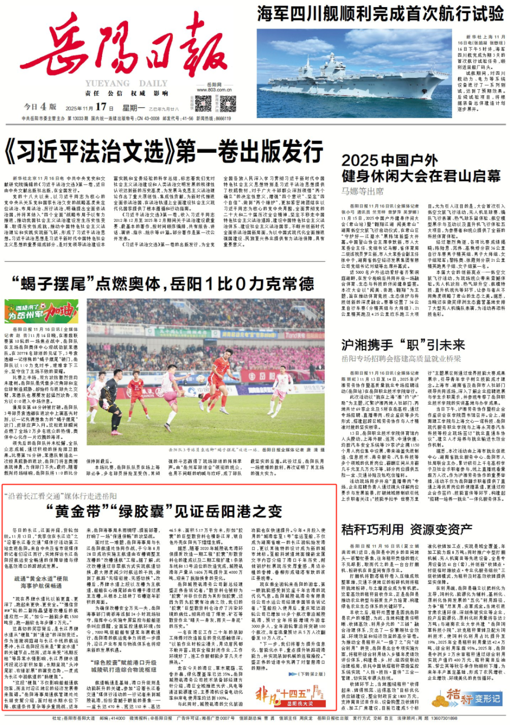 从海事部门的精准护航,到港口的绿色转型,一条更加畅通、安全、高效的长江黄金水道,正为岳阳、为长江中上游航运经济注入源源不断的新动能。站在城陵矶港,目送巨轮穿梭、列车轰鸣,一幅“人享其行、物畅其流”的现代化水运画卷,正在长江中游澎湃展开。